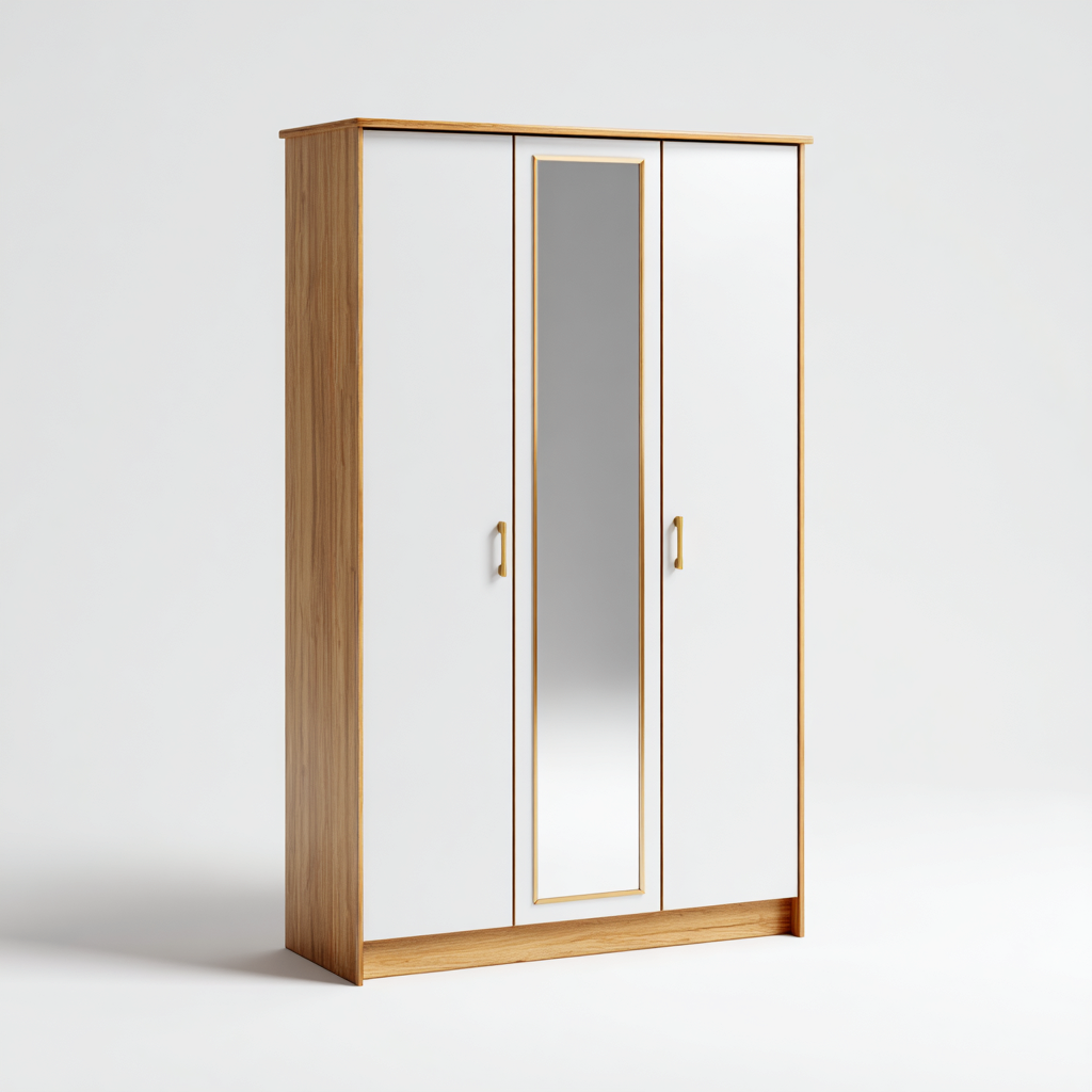 Questo armadio presenta una struttura dal profilo pulito e contemporaneo, caratterizzata dall'unione di finitura bianca e bordi in rovere. L'anta centrale con specchio integrato offre un supporto pratico nella preparazione quotidiana, mantenendo un'estetica luminosa e ordinata.