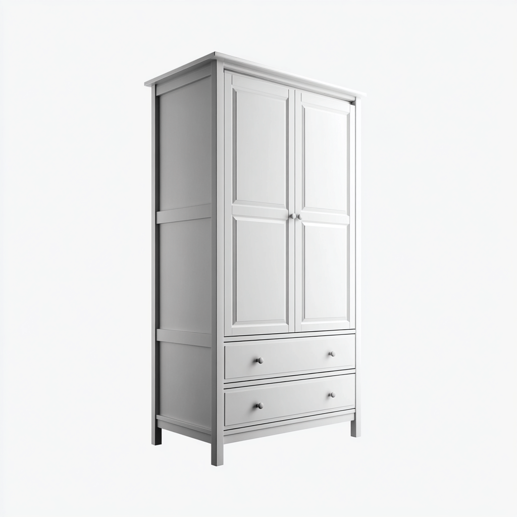 Questo armadio offre una struttura dal profilo classico con finitura bianca opaca e proporzioni bilanciate. Le superfici lineari e l'aspetto sobrio facilitano l'inserimento in camere arredate con gusto tradizionale, garantendo uno spazio ordinato per la disposizione degli indumenti.