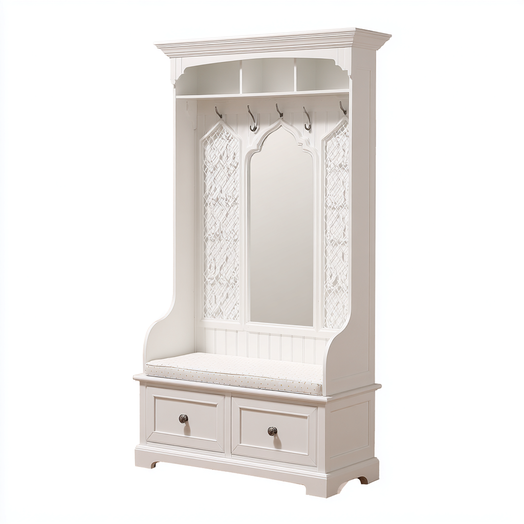 Questo attaccapanni abbina elementi decorativi classici a funzioni pratiche per l'ingresso. Lo specchio centrale e la seduta integrata facilitano la preparazione quotidiana, mentre la struttura slanciata valorizza l'ambiente domestico.