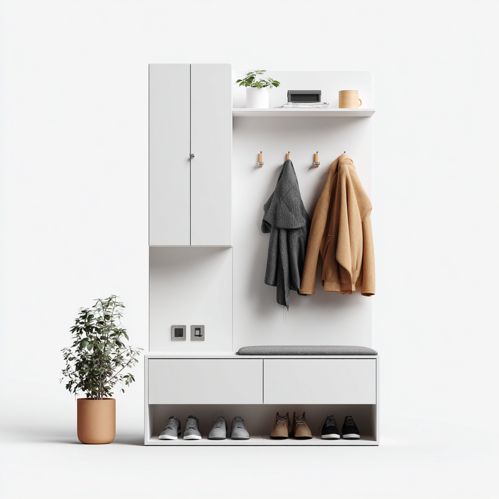 Include ganci per appendere capi d'abbigliamento, seduta imbottita per facilitare la preparazione quotidiana e una base inferiore utile alla disposizione delle calzature. Il vano chiuso laterale consente di riporre oggetti personali mantenendo ordine visivo.