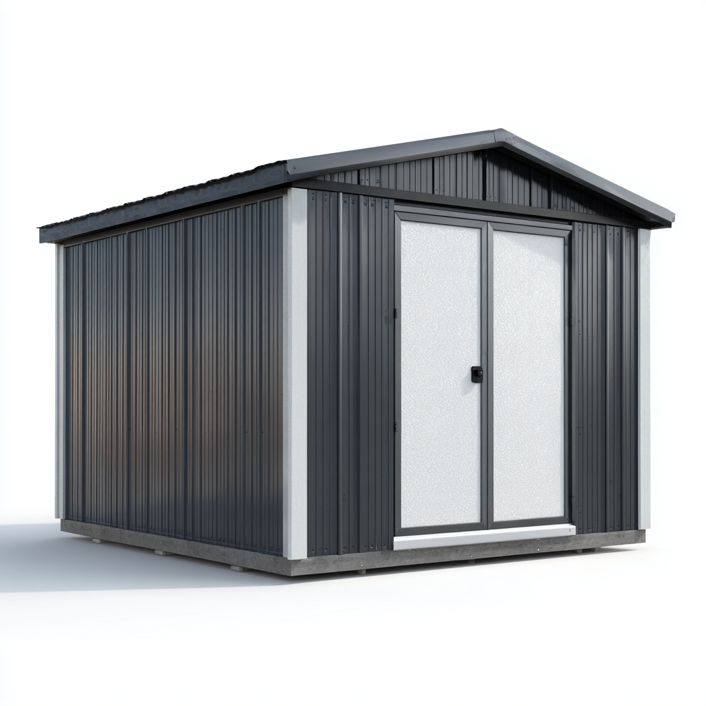La costruzione utilizza pannelli metallici grigio scuro abbinati a elementi in acciaio argento. Le superfici rigide e la finitura resistente agli agenti atmosferici garantiscono una buona stabilità nel tempo.