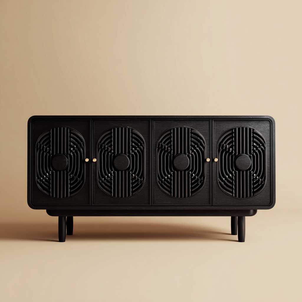 Credenza moderna caratterizzata da un'estetica scultorea e da una struttura compatta pensata per organizzare oggetti domestici. Le superfici scure e i pannelli frontali lavorati conferiscono un aspetto distintivo adatto a soggiorni e zone living contemporanee.