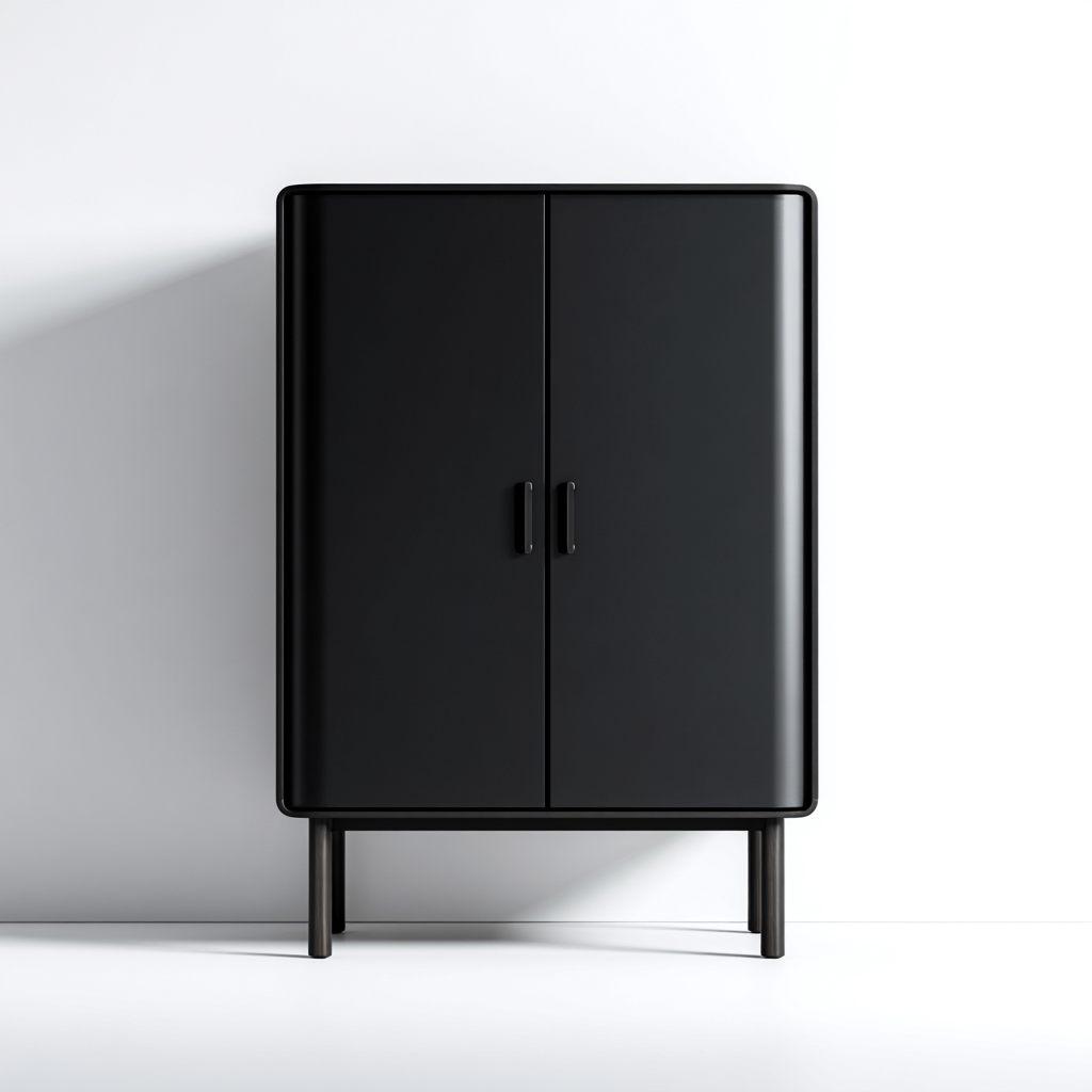 Realizzata in legno con finitura nera uniforme abbinata a basi in metallo. Le ante presentano una superficie liscia con bordi arrotondati che valorizzano l'estetica sobria dell'arredo. La lavorazione accurata garantisce stabilità e durata nel tempo.