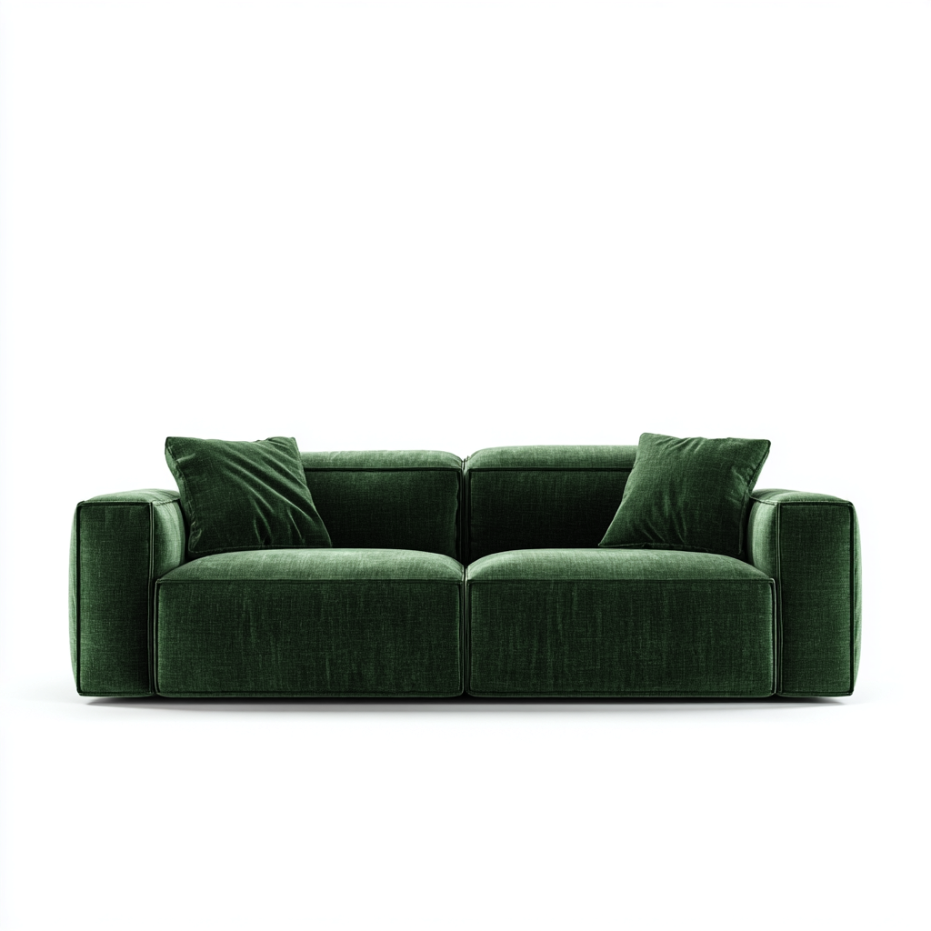 Questo divano a 3 posti in tessuto verde presenta forme compatte pensate per ambienti moderni. Il profilo solido e la seduta ampia contribuiscono a creare un punto focale nel soggiorno.