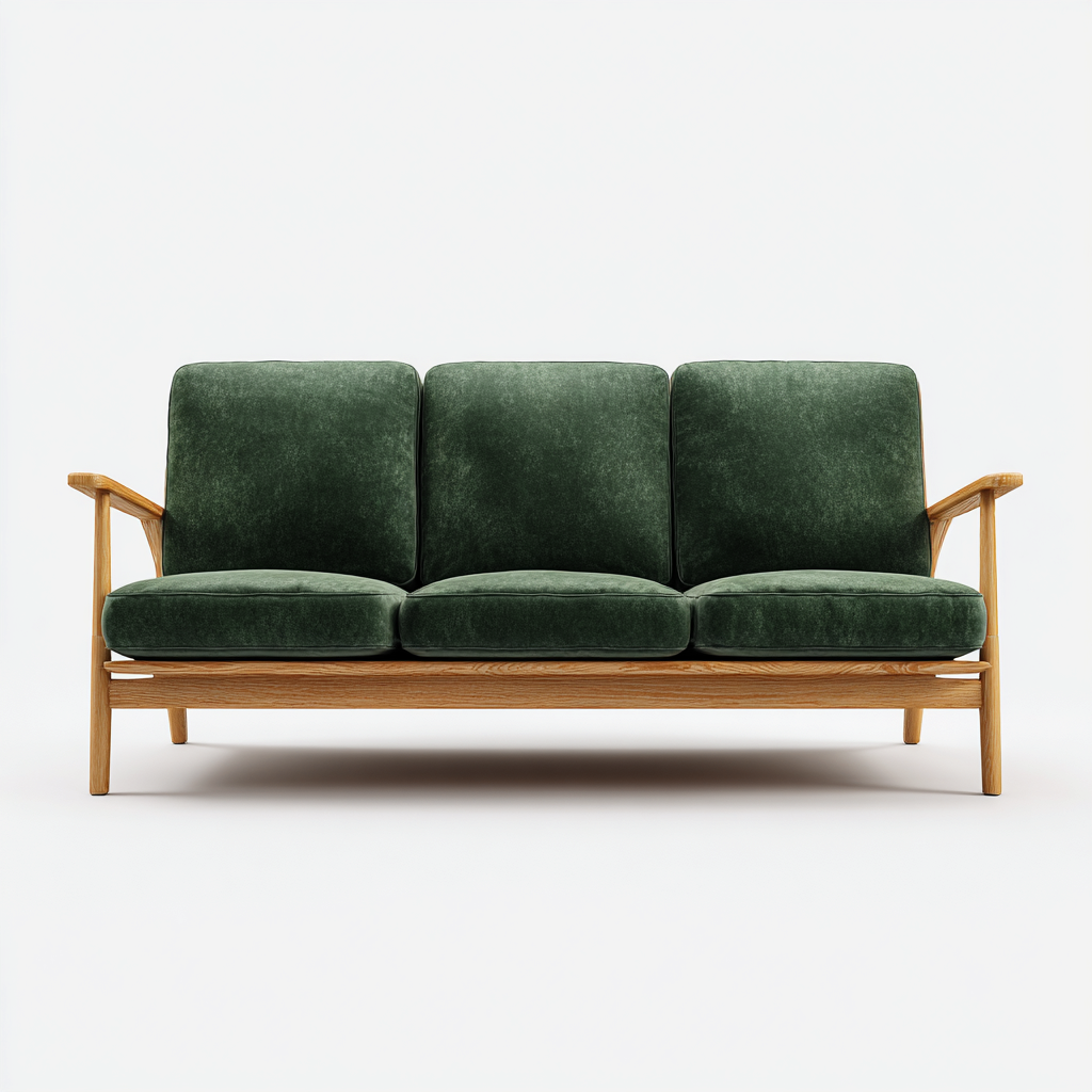 Il rivestimento in tessuto verde scuro presenta una texture uniforme. La struttura in legno chiaro garantisce stabilità e valorizza l'estetica naturale del divano.