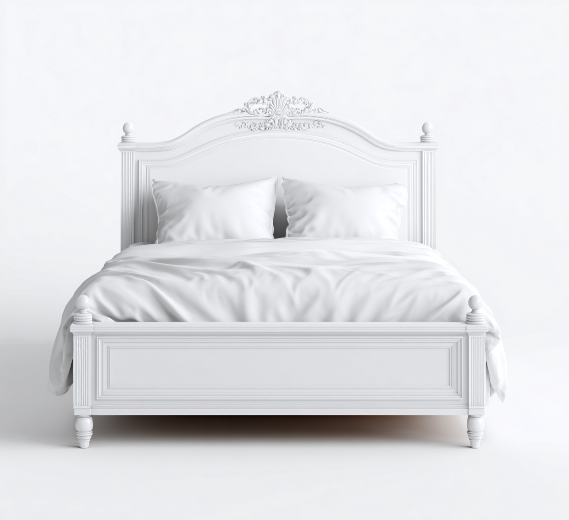La struttura in legno con finitura bianca liscia conferisce un aspetto luminoso e uniforme. La testiera scolpita offre un valore estetico aggiuntivo, mentre la superfice trattata facilita la manutenzione quotidiana.
