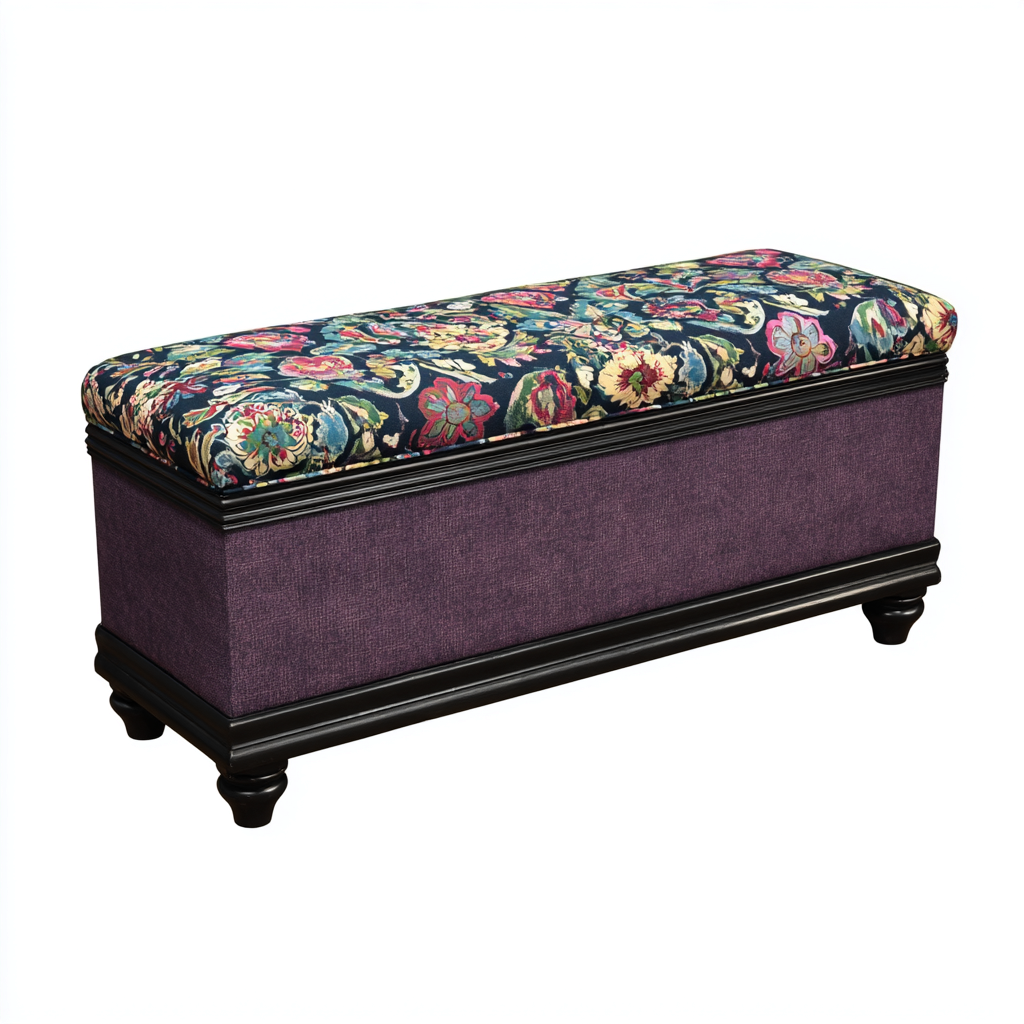 Questa panca per letto combina un'estetica classica con una seduta rivestita in tessuto multicolore a fantasia floreale e una base in tessuto viola. La struttura in legno scuro dona stabilità e carattere, rendendola un complemento ideale per camere dal gusto tradizionale o ambienti che richiedono un tocco decorativo.