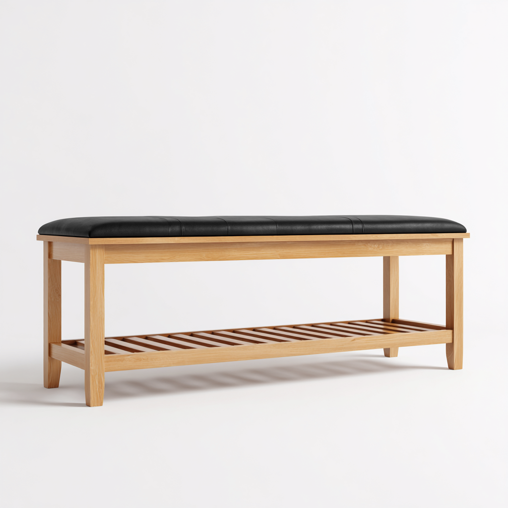 Questa scarpiera con seduta integrata unisce praticità e comfort, offrendo uno spazio ordinato per le calzature e una comoda base d'appoggio per l'ingresso o la camera da letto. Il contrasto tra il legno chiaro e la seduta nera dona un aspetto moderno.