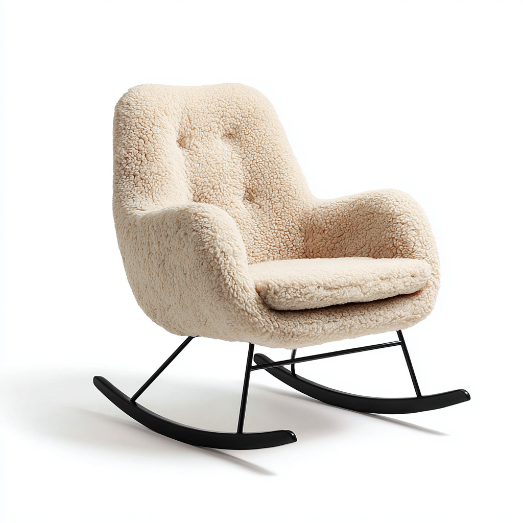Il rivestimento in tessuto bouclé beige presenta una texture morbida e calda. La struttura combina un telaio in metallo verniciato nero e basi curve in legno, garantendo stabilità e un movimento di dondolio fluido.