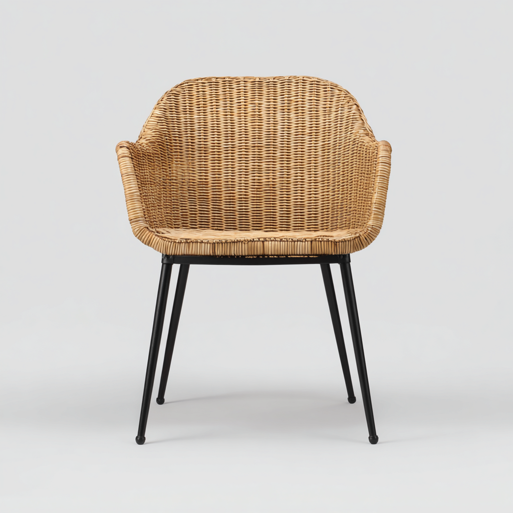 Il rattan naturale si distingue per la sua texture calda e regolare. Il metallo della struttura fornisce sostegno e durata. Le finiture sono curate per valorizzare la combinazione dei materiali e mantenere un'estetica armoniosa.