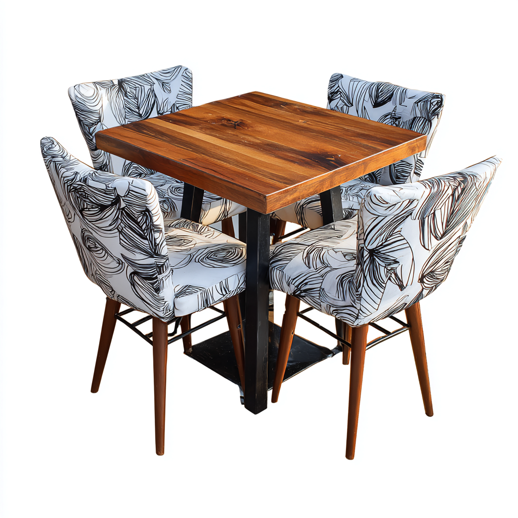 Il set include un tavolo con piano in legno e quattro sedie imbottite con rivestimento decorativo, pensato per ambienti moderni. La struttura solida sostiene un utilizzo quotidiano e offre un aspetto elegante.