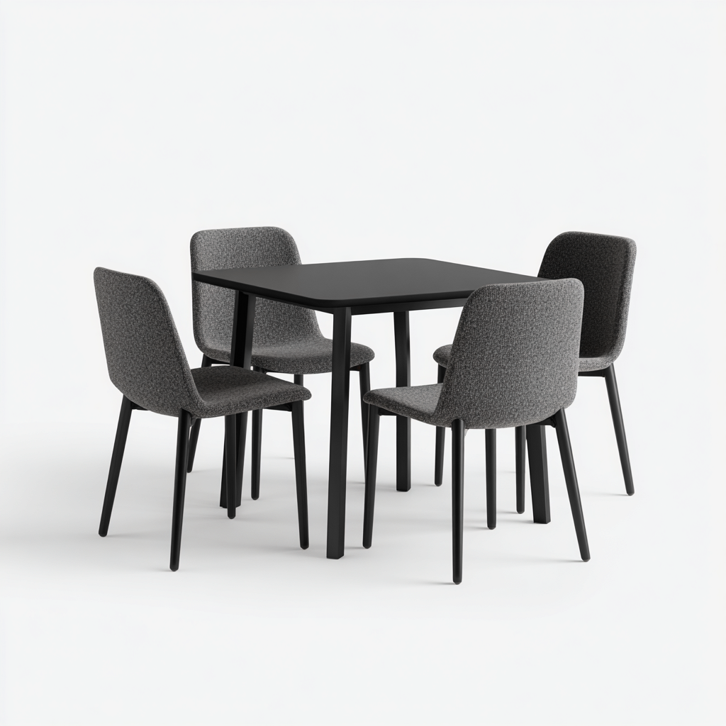 Questo set da pranzo moderno comprende un tavolo quadrato in legno nero e quattro sedie imbottite in tessuto grigio. La struttura compatta permette un facile inserimento in cucine e sale da pranzo dalle dimensioni contenute, offrendo al contempo una seduta confortevole.